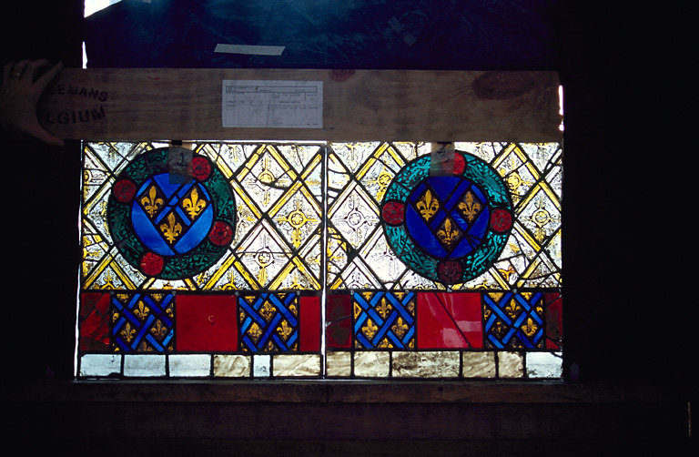 POP | Plateforme ouverte du patrimoineverrière : Panneaux 2, 3 (Ap. R.) La bordure inférieure est une alternance de motifs bleus et rouges entre deux filets blancs. Vers le centre du vitrail, un motif de losanges orné de feuilles quadripétales. Sur ce motif est placé une couronne de feuillages dont le fond, bleu, est orné de trois fleurs de lys.