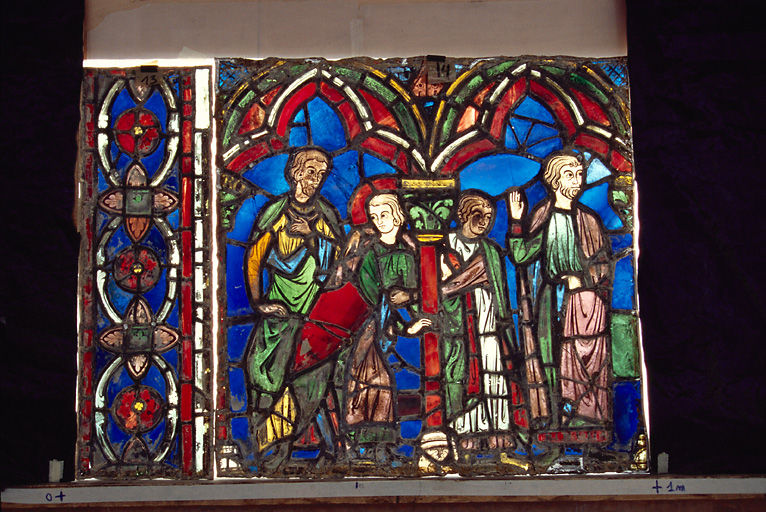 POP | Plateforme ouverte du patrimoineverrière : Panneaux 13, 14 (Ap. R.) bordure à rosettes, fleurons et entrelacs ; saint Chéron caché derrière un pilier se détourne de sa promise.