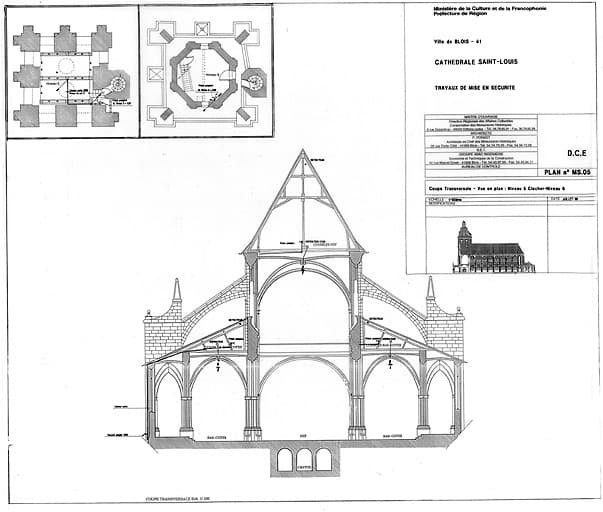 Cathédrale Saint-Louis : TRAVAUX DE MISE EN SECURITE, modification des issues : coupe transversale ; plan du niveau 5 du clocher ; plan du niveau 6 du clocher. (D C E)
