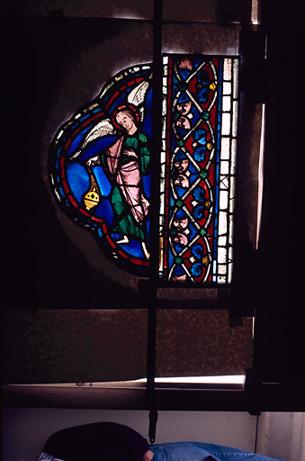 verrière : Panneaux 43 et 44 (Ap. R.) demi quadrilobe, un ange ; bordure de palmettes dans des entrelacs.