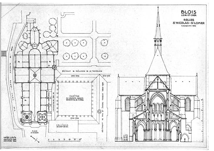 Eglise Saint-Nicolas-Saint-Lomer : plan masse et des abords ; coupe transversale.