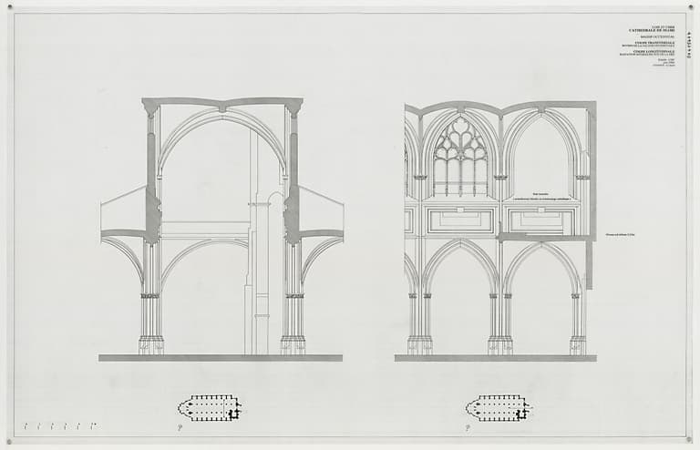 POP | Plateforme ouverte du patrimoineCathédrale Saint-Louis : Massif occidental : coupe transversale, revers de la façade occidentale ; coupe longitudinale, élévation interieure sud de la nef.