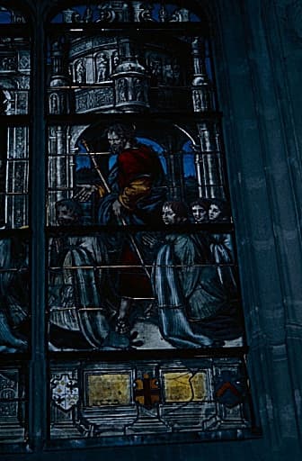 Verrière de la chapelle de Pierre Tullier (baie 32) : Troisième lancette : Jehan, François et Pierre Tullier, les enfants, présentés par saint Jean.