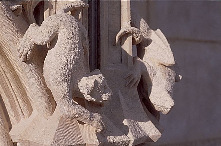 Hôtel, dit Palais Jacques Coeur : Façade est, sur rue (Ap. R) : baldaquin du pavillon d'entrée, deux animaux grotesques en haut de la colonnette de gauche (détail).