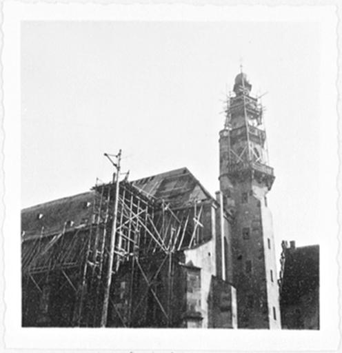 Travaux de charpente, façade nord et tour ouest, vue partielle.