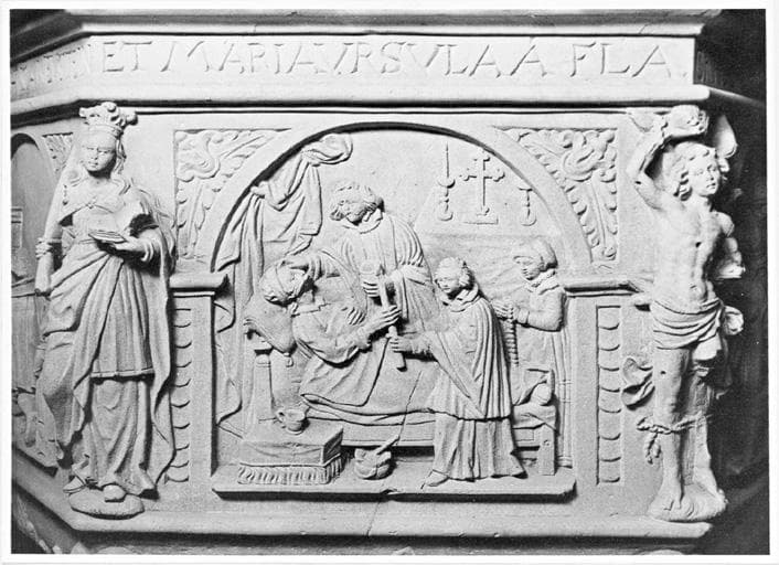 Fonts baptismaux, détail du relief de la Pénitence.