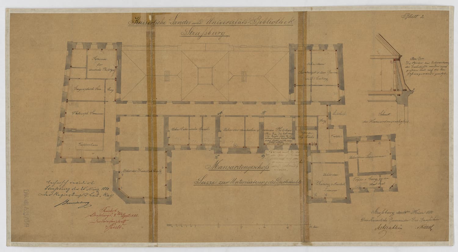 Projet d’aménagement en bibliothèque universitaire, plan de l’étage mansardé et du corps de logis.
