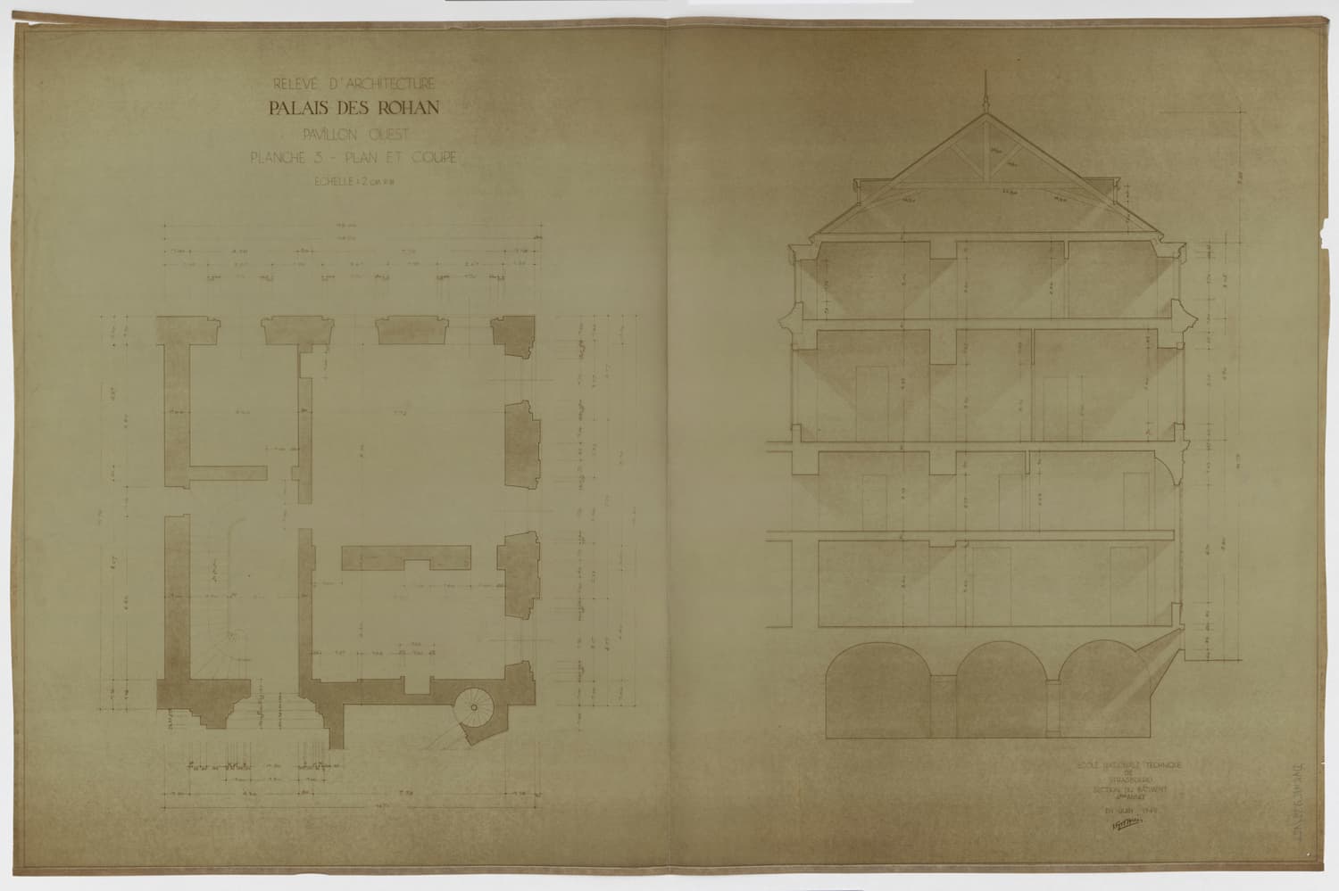 Pavillon ouest, plan de masse du rez-de-chaussée et coupe transversale.