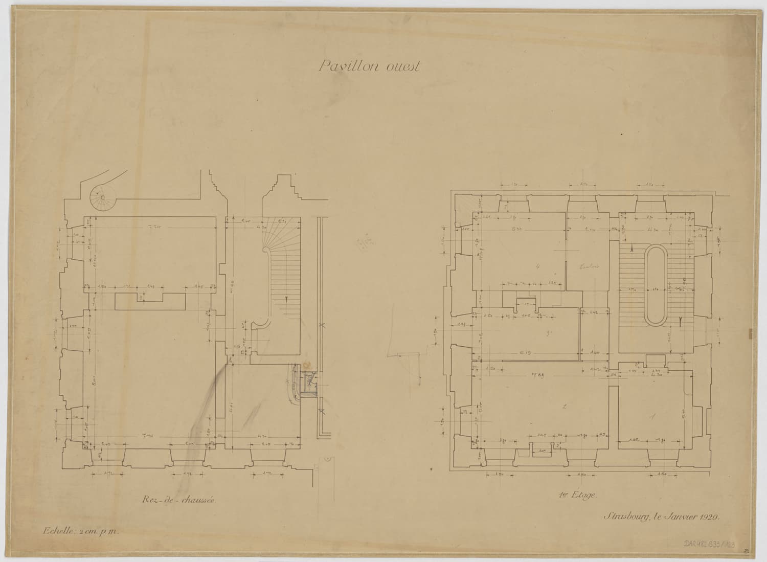 Pavillon ouest, plans de masse du rez-de-chaussée et du premier étage.