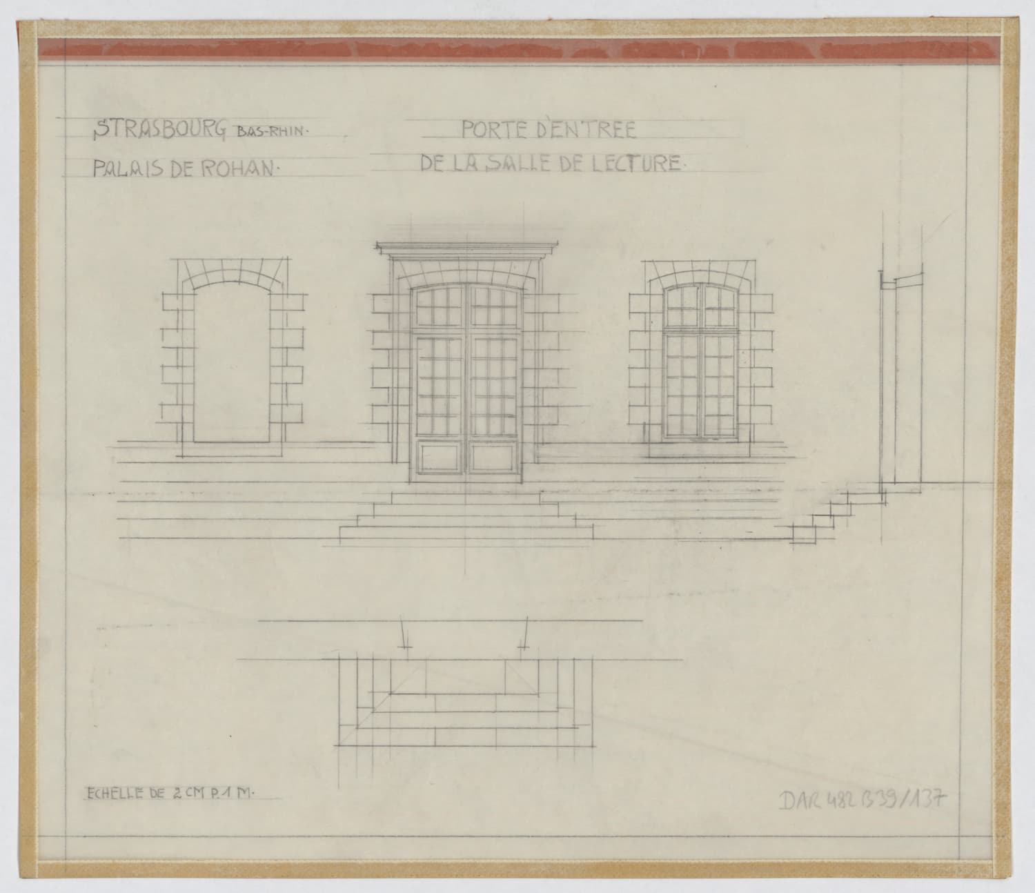 Salle de lecture, plan, élévation et coupe de la porte d’entrée.