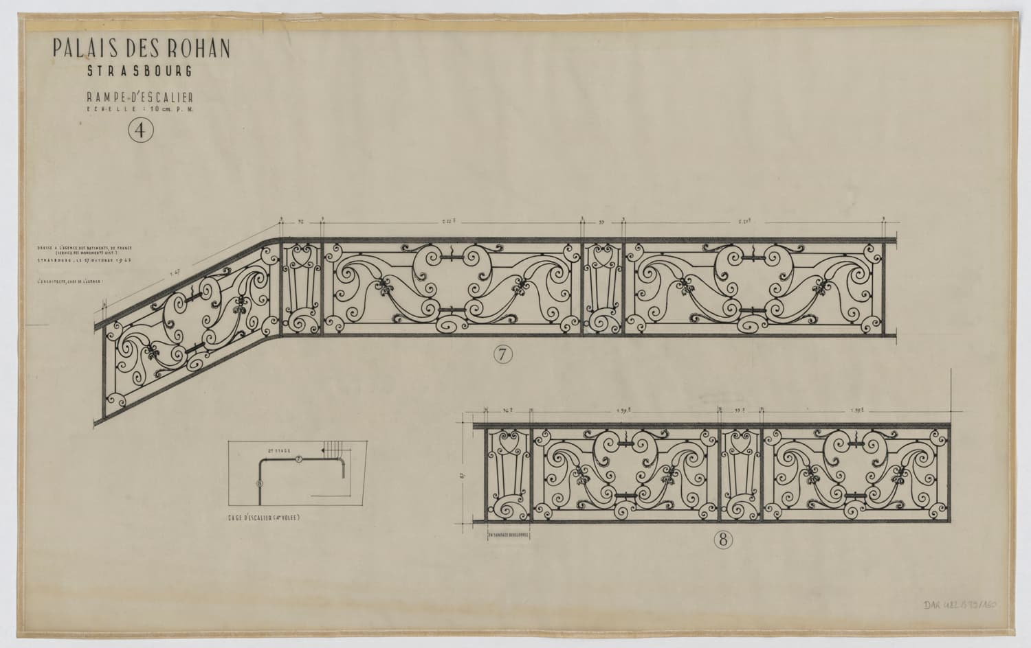 Escalier d’honneur, plan de masse de la quatrième volée et détails de la rampe en fer forgé.