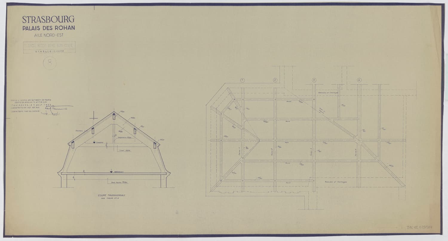 Travaux de restauration de l’aile nord-est, plan et coupe transversale sur la charpente en béton armé.