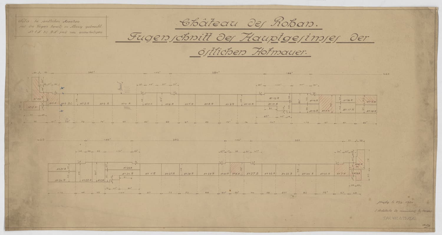 Façade est sur cour, sections stéréotomiques de la corniche principale.