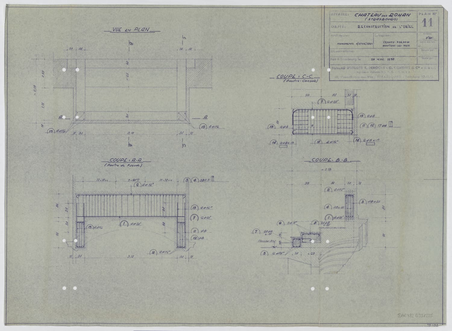 Reconstruction de l’oriel, plan de masse et coupes.
