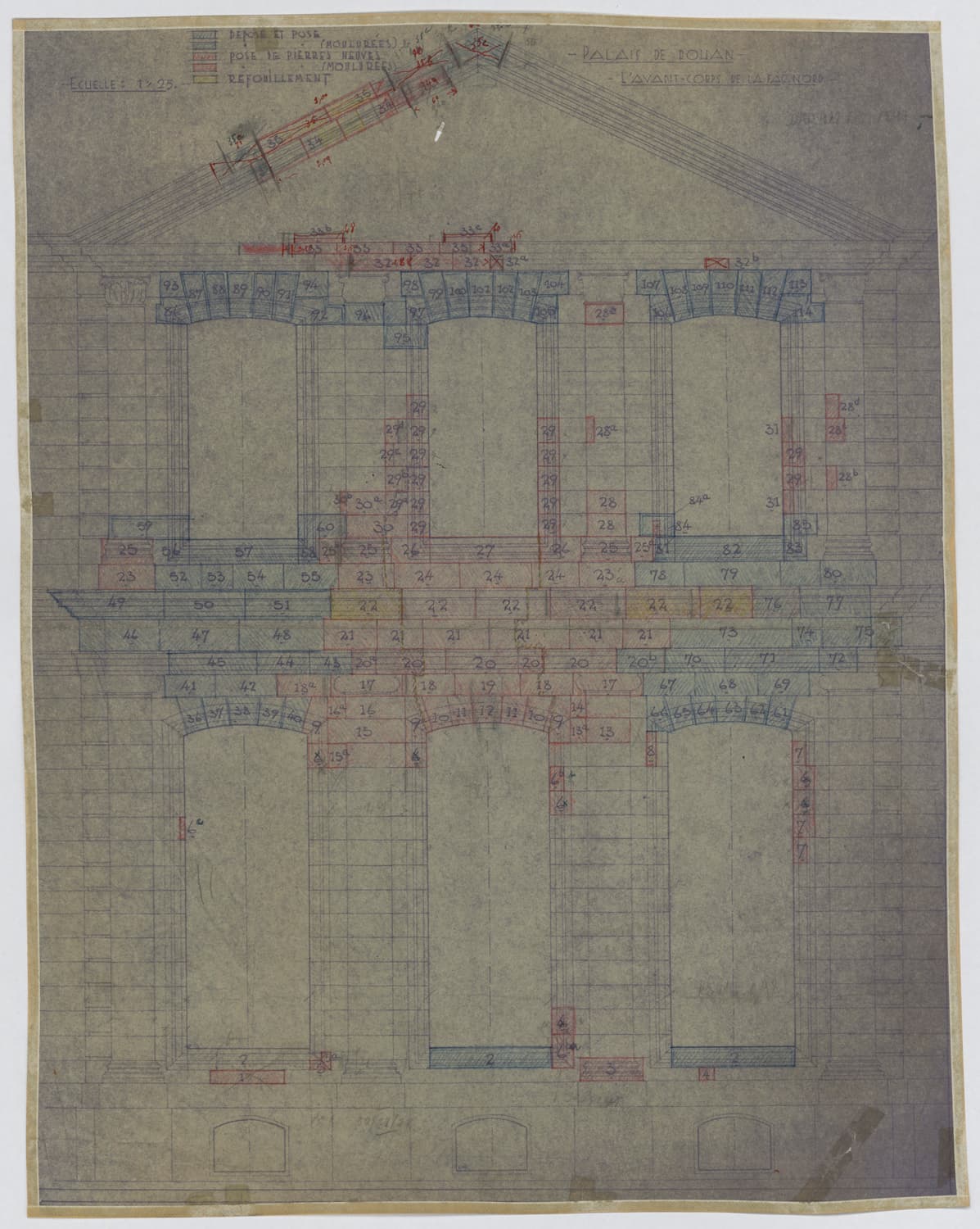 Projet de restauration, élévation de l’avant-corps de la façade nord.