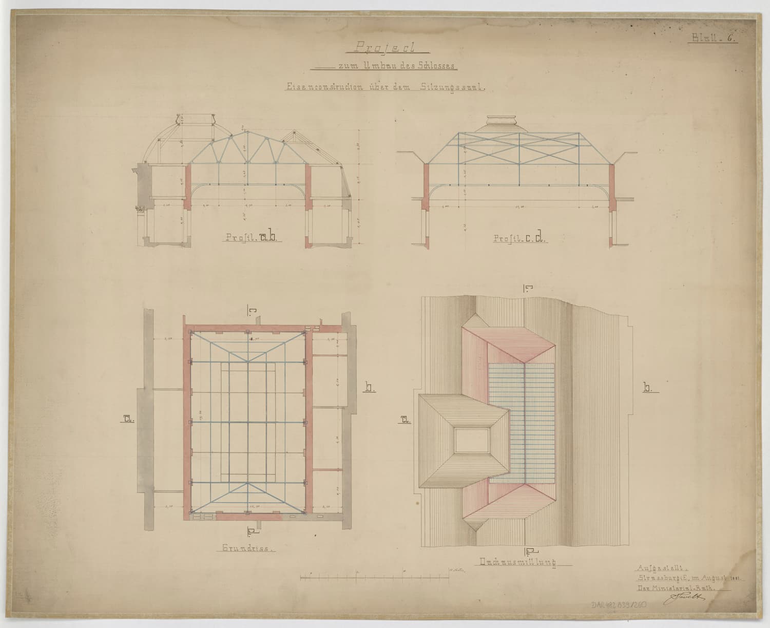 Projet de transformation de la salle d’audience, plans et coupes sur la charpente métallique.