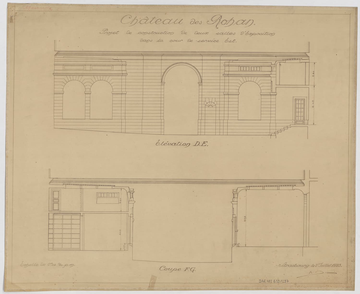 Projet de construction de deux salles d'exposition dans la cour est, élévation et coupe de la façade est.