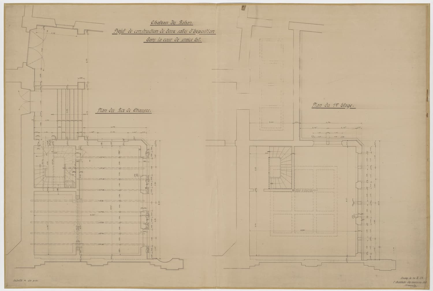 Projet de construction de deux salles d’exposition dans la cour est, plans de masse du rez-de-chaussée et du premier étage.