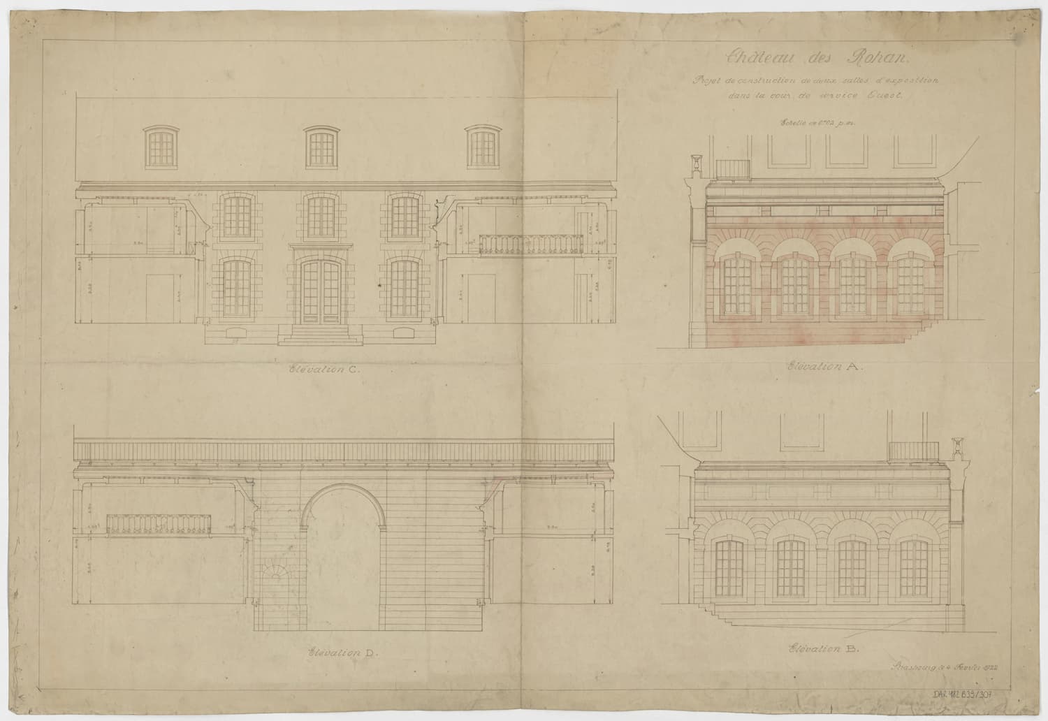 Projet de construction de deux salles d'exposition dans la cour ouest, élévation des façades est et ouest.