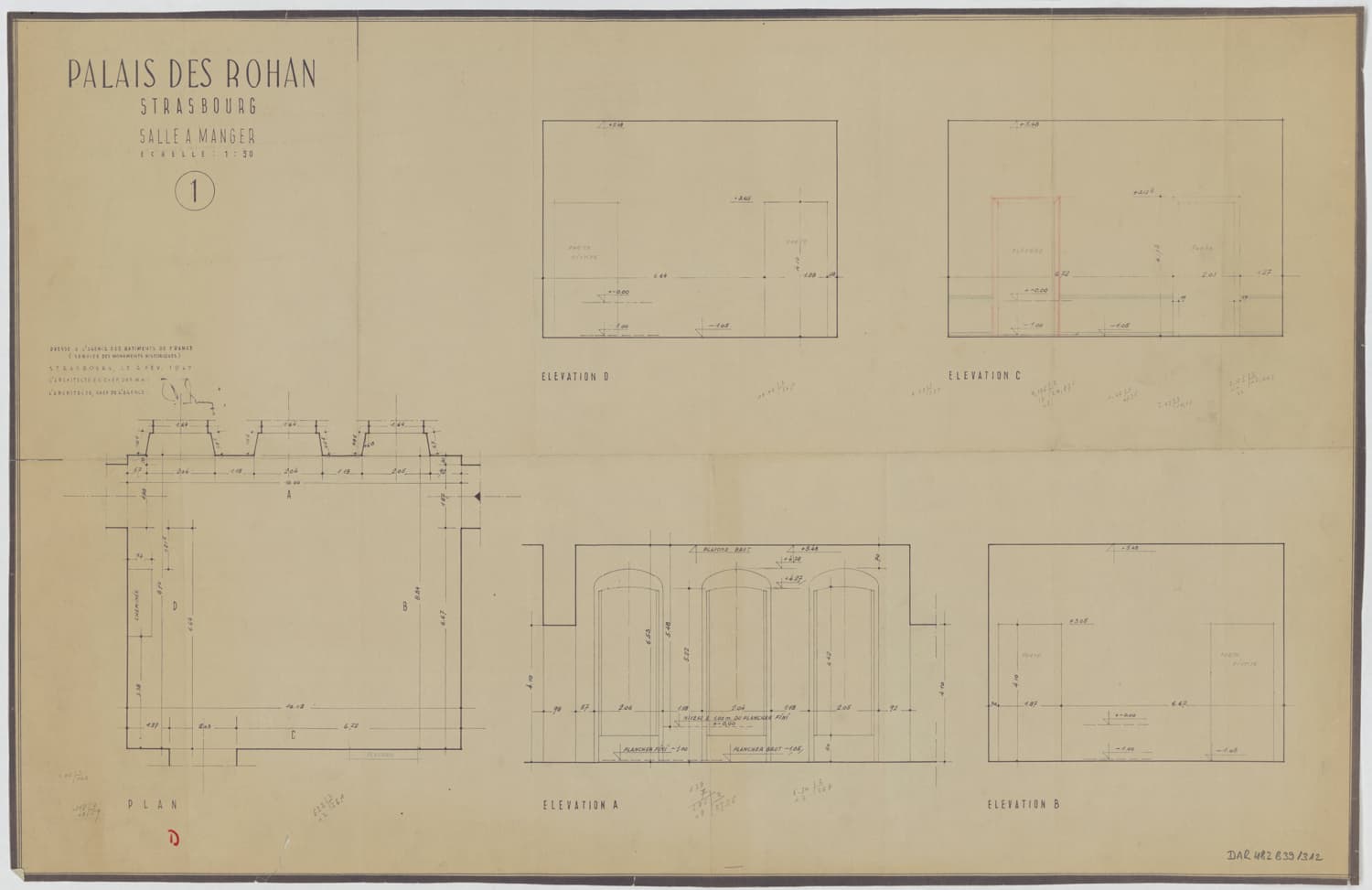Salle à manger, plan de masse et élévations.