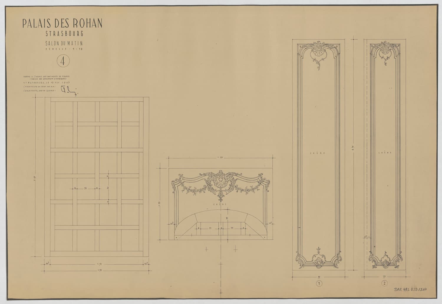 Salon du matin, plan, élévations des boiseries et de la cheminée du mur est.