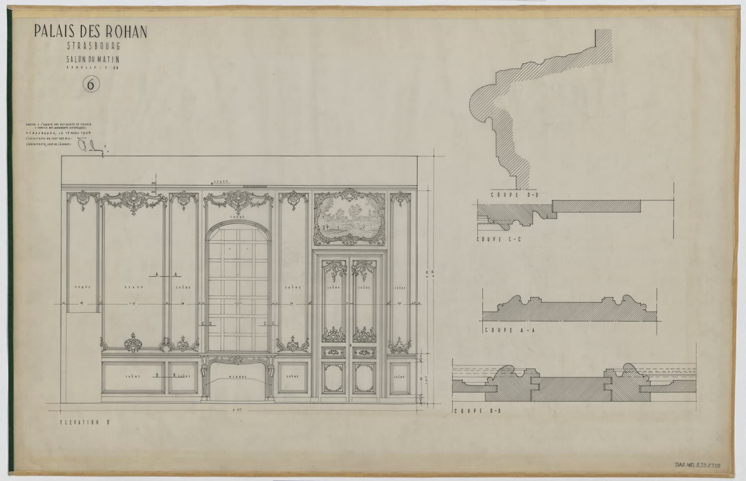Salon du matin, élévation, coupes et détails des boiseries du mur ouest.