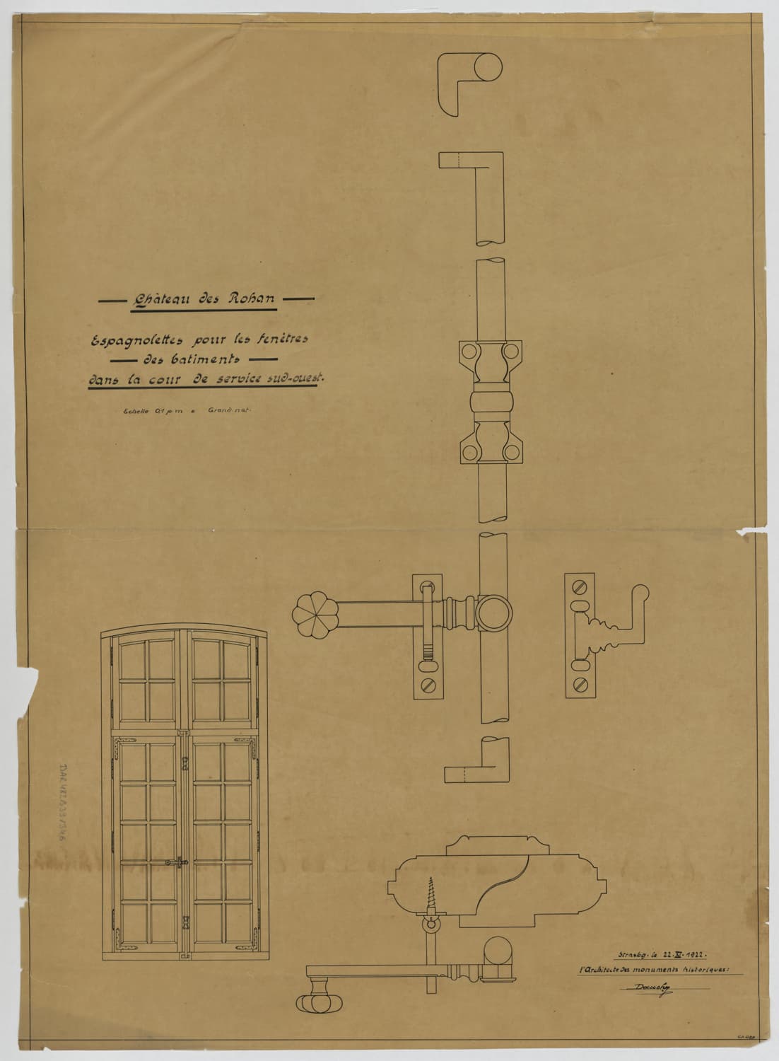 Aile ouest, élévation et détails des espagnolettes des fenêtres.