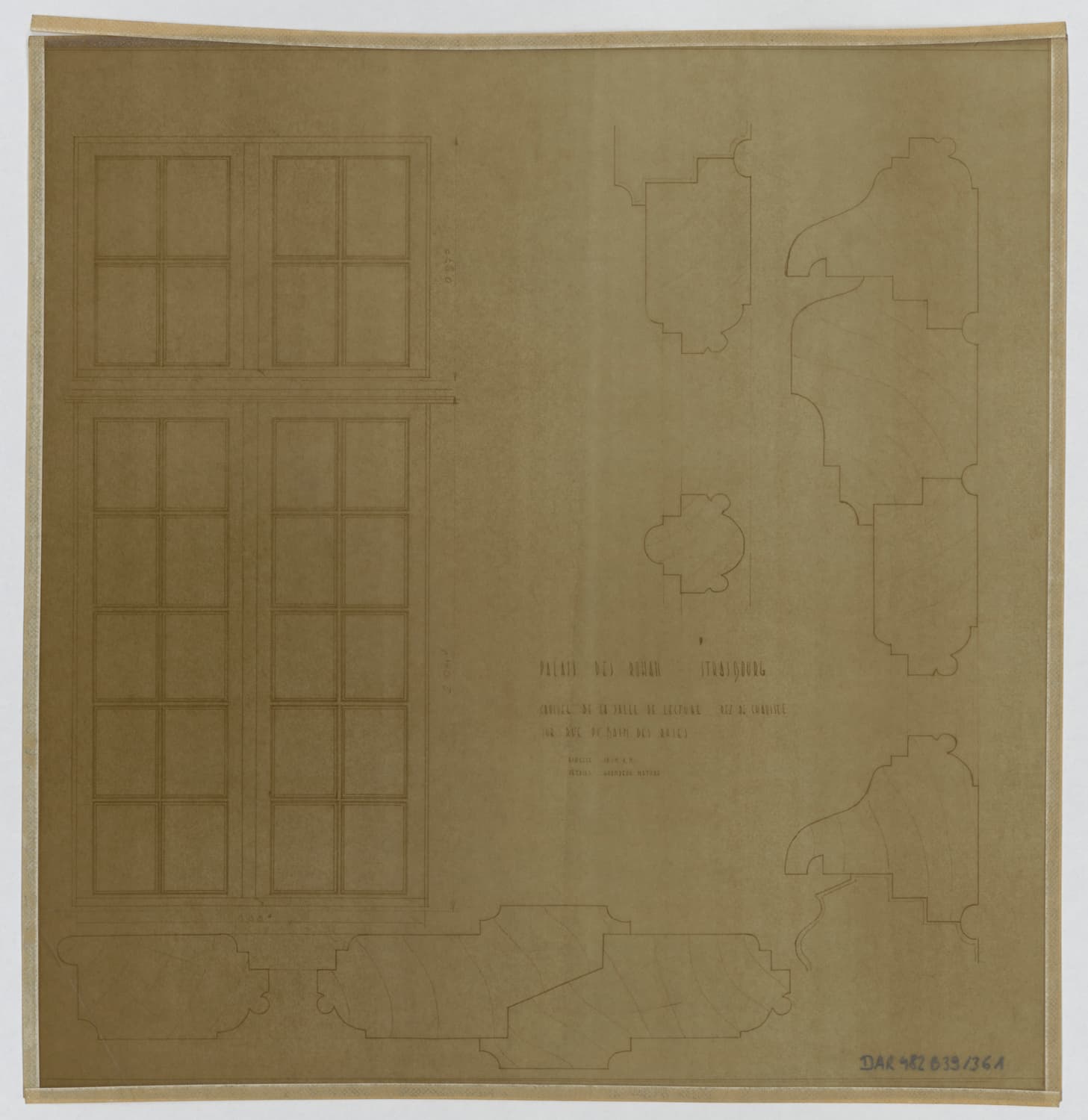 Salle de lecture, élévation, coupe et détails des fenêtres du rez-de-chaussée du côté sud.