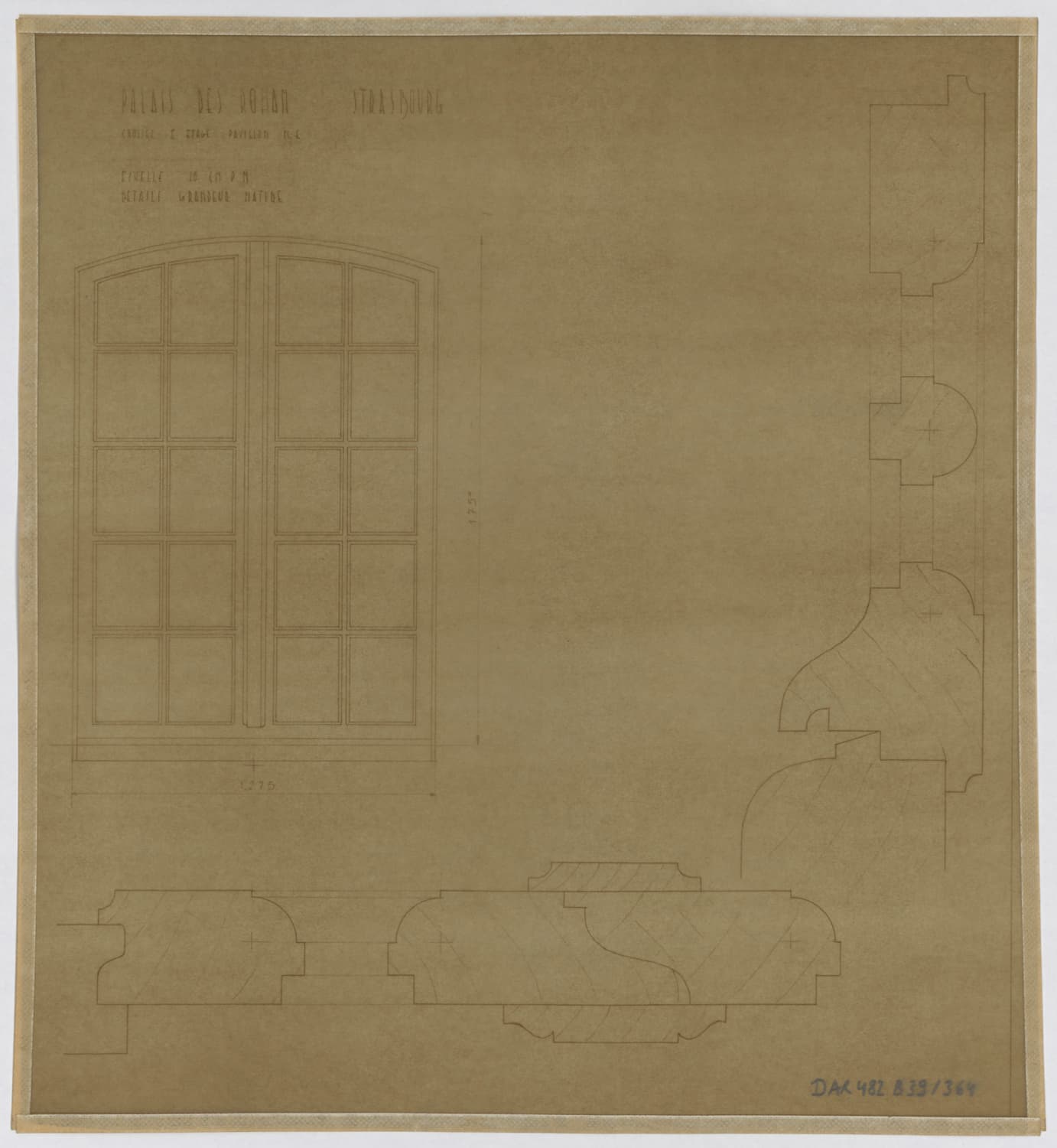 Pavillon nord-est, élévation, coupe et détails des fenêtres du premier étage.