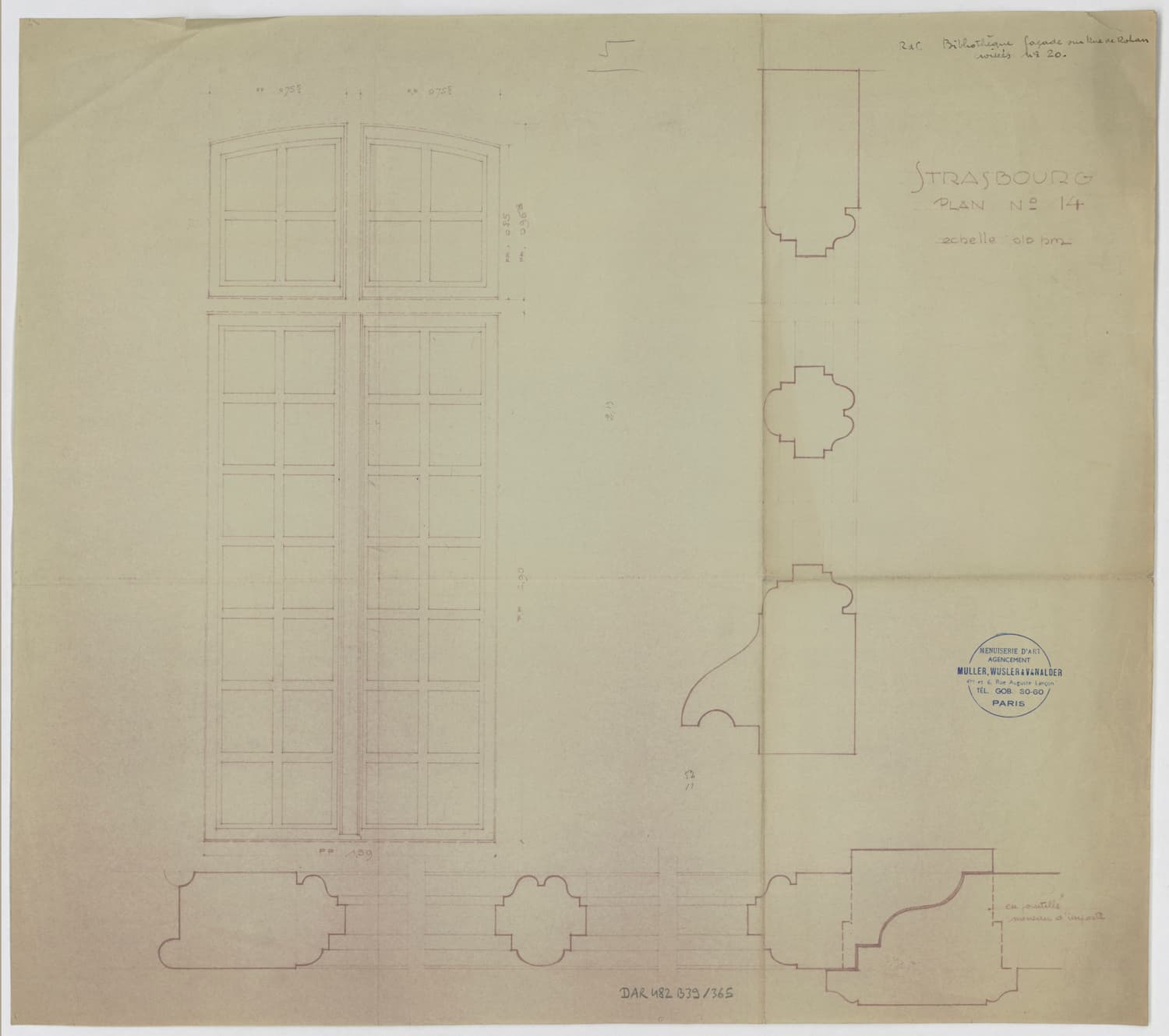 Façade est, élévation, coupes et détails des fenêtres.