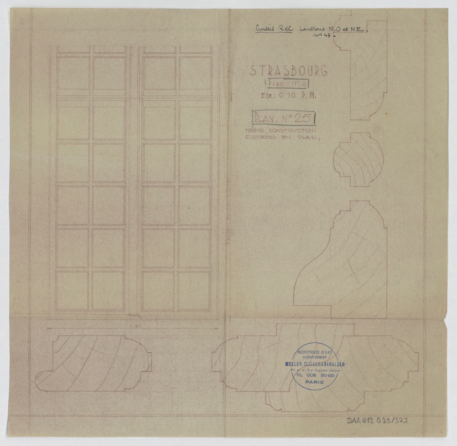 Pavillons nord-ouest et nord-est, élévation et coupes des fenêtres du rez-de-chaussée.