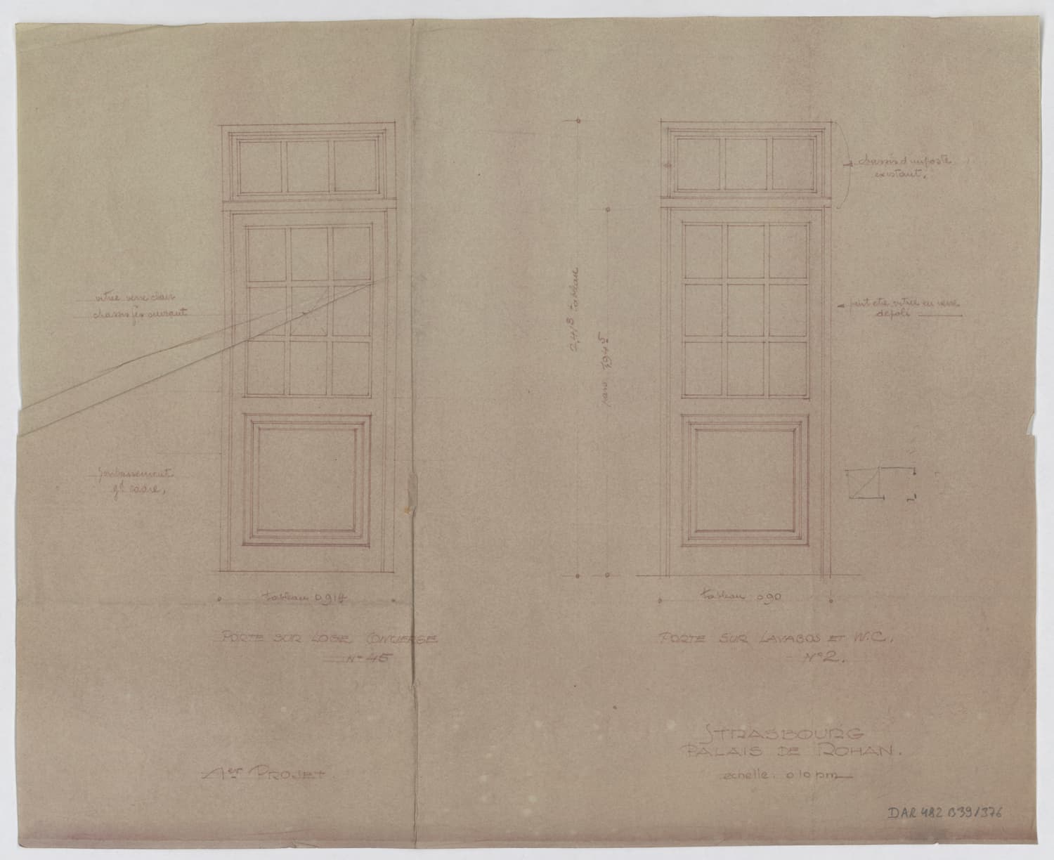 Loge du concierge et sanitaires, élévation des portes (projet 1).