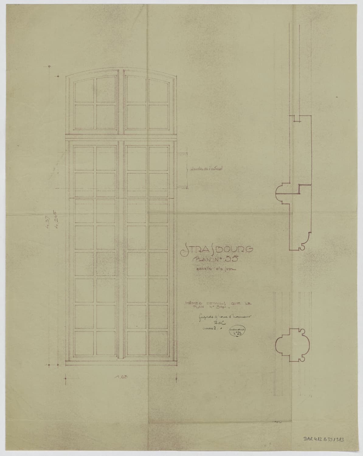 Façade nord, élévation et coupe des fenêtres du rez-de-chaussée.