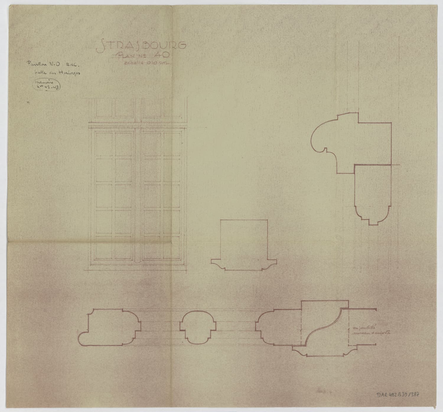 Pavillon nord-ouest, élévation et coupes des fenêtres du rez-de-chaussée.