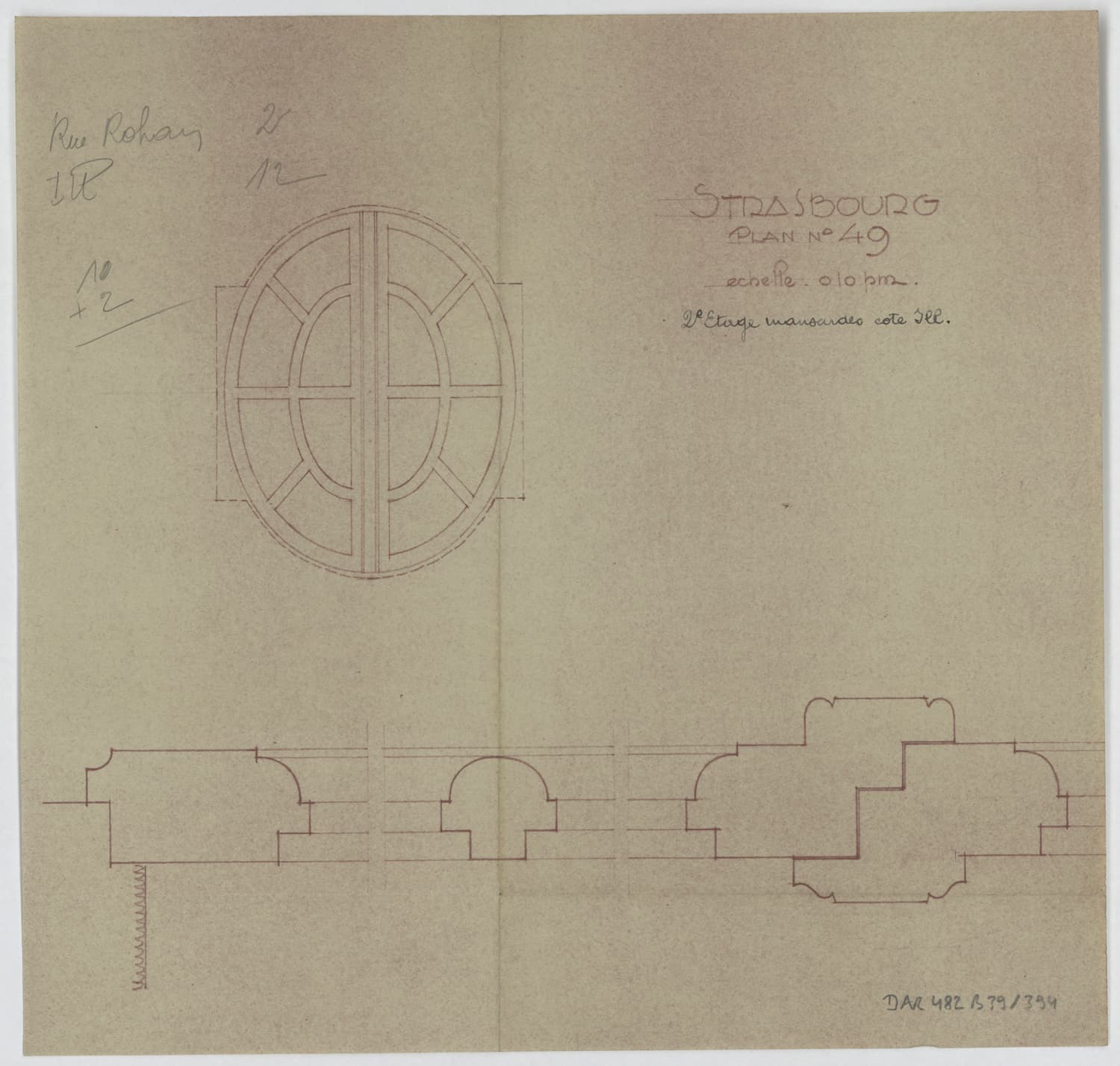 Mansardes côté sud, élévation et coupe des oculus du deuxième étage.