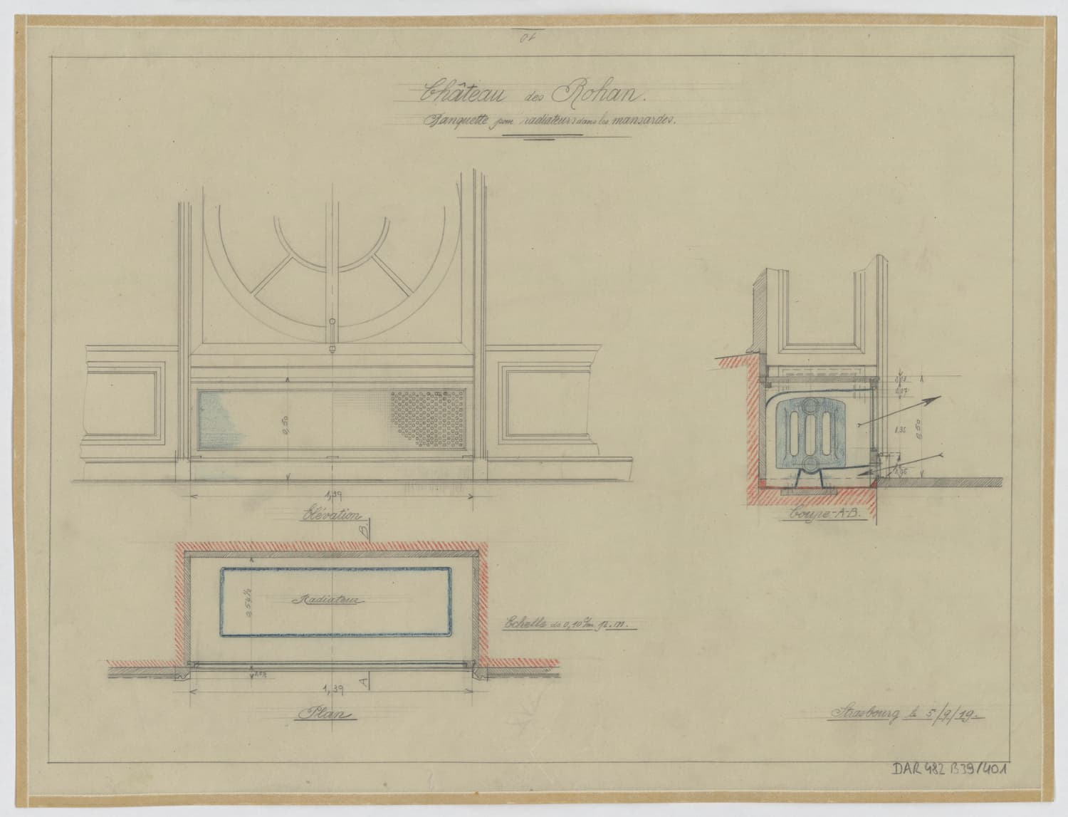 Mansardes, plan, élévation et coupe des banquettes pour radiateurs.