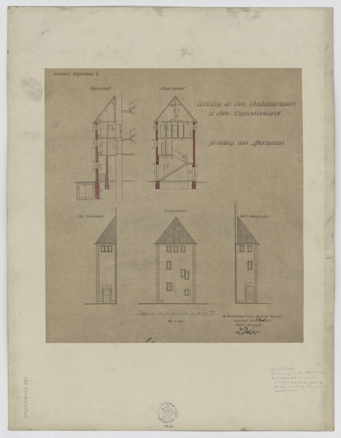 Projet de transformation en hôpital militaire, élévations et coupes.