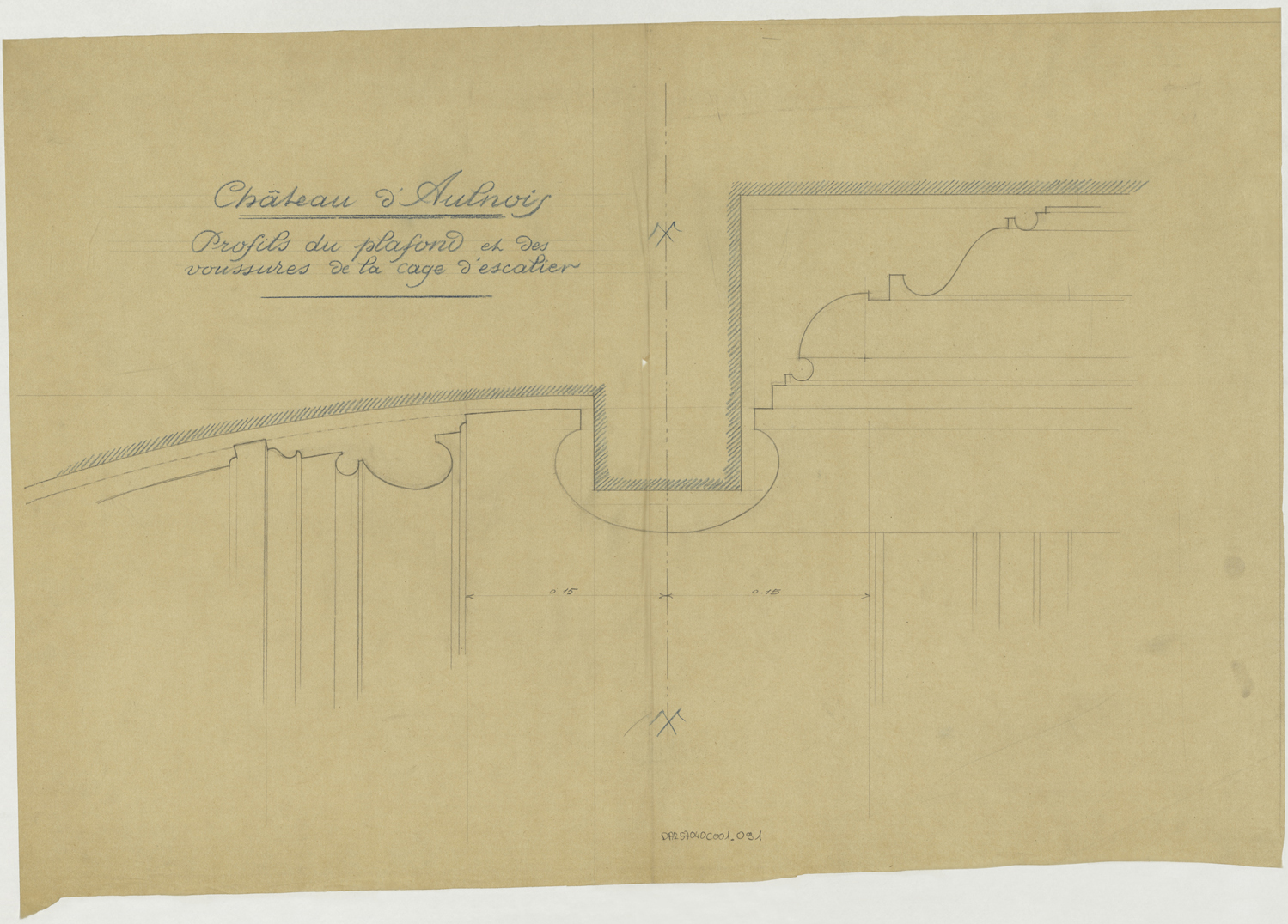 Grand escalier, profils de moulures du plafond et des voussures de la cage d’escalier.