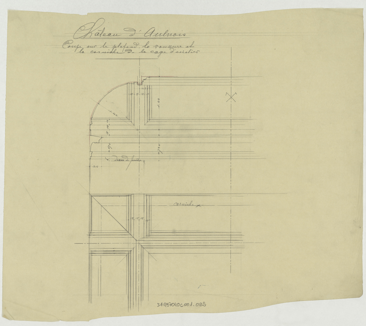 Grand escalier, coupe sur le plafond, la voussure et la corniche de la cage d’escalier.