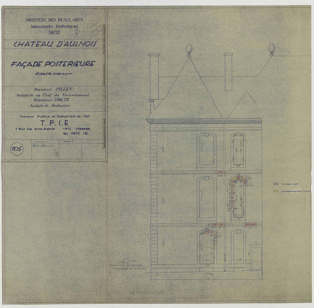 Projet de restauration de la façade est, élévation.