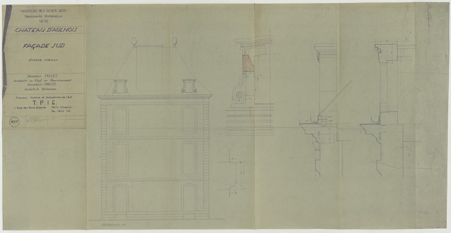 Projet de restauration de la façade sud, élévations et coupes sur la lucarne.