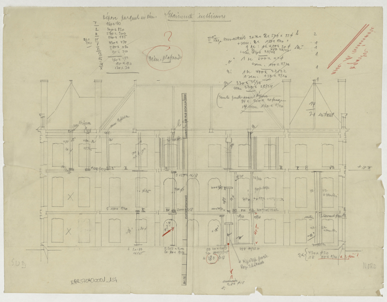 Projet de consolidation, coupe longitudinale sur la façade ouest avec étaiements.