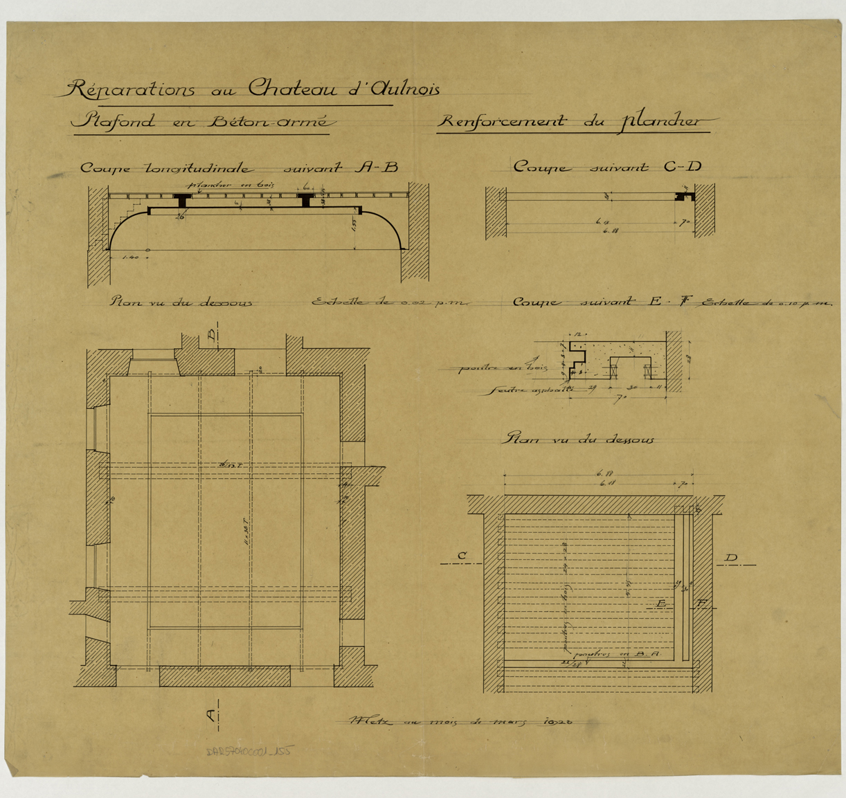 Projet de voûte en béton armé, coupes et plans du plafond et de son renforcement.