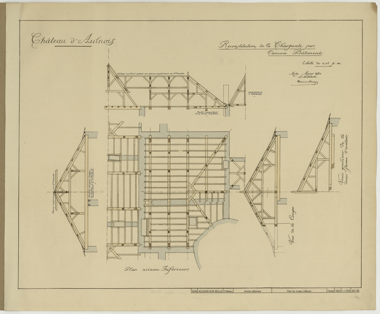Reconstitution de la charpente de l’ancien bâtiment, plan et coupes du niveau inférieur.