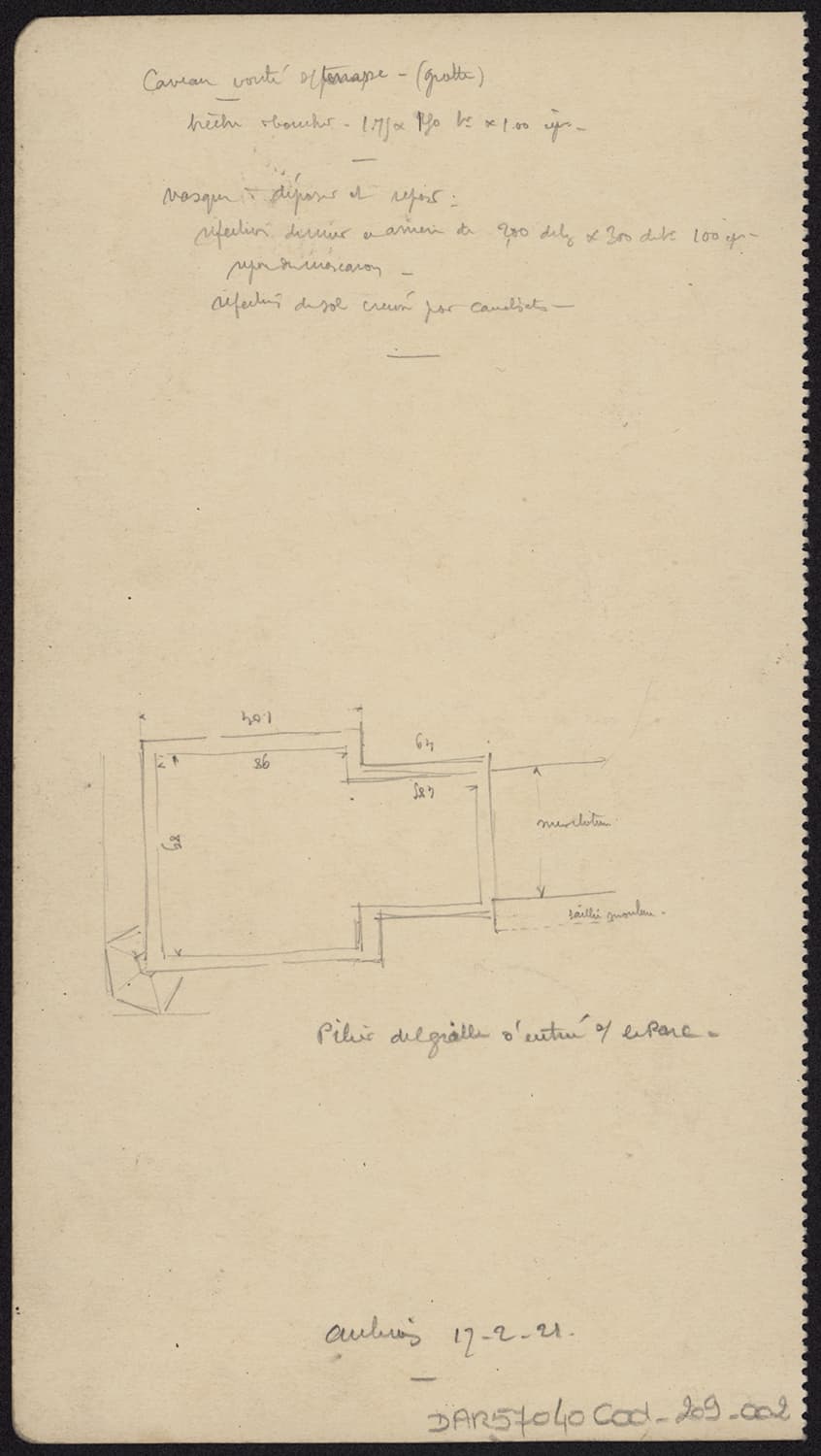 Note manuscrite relative aux travaux à effectuer dans la grotte sous le perron et croquis d’un pilier.