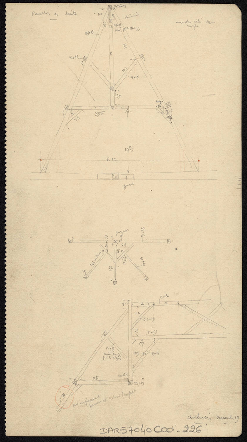 Charpente, plan du pavillon nord et plans d’assemblage.