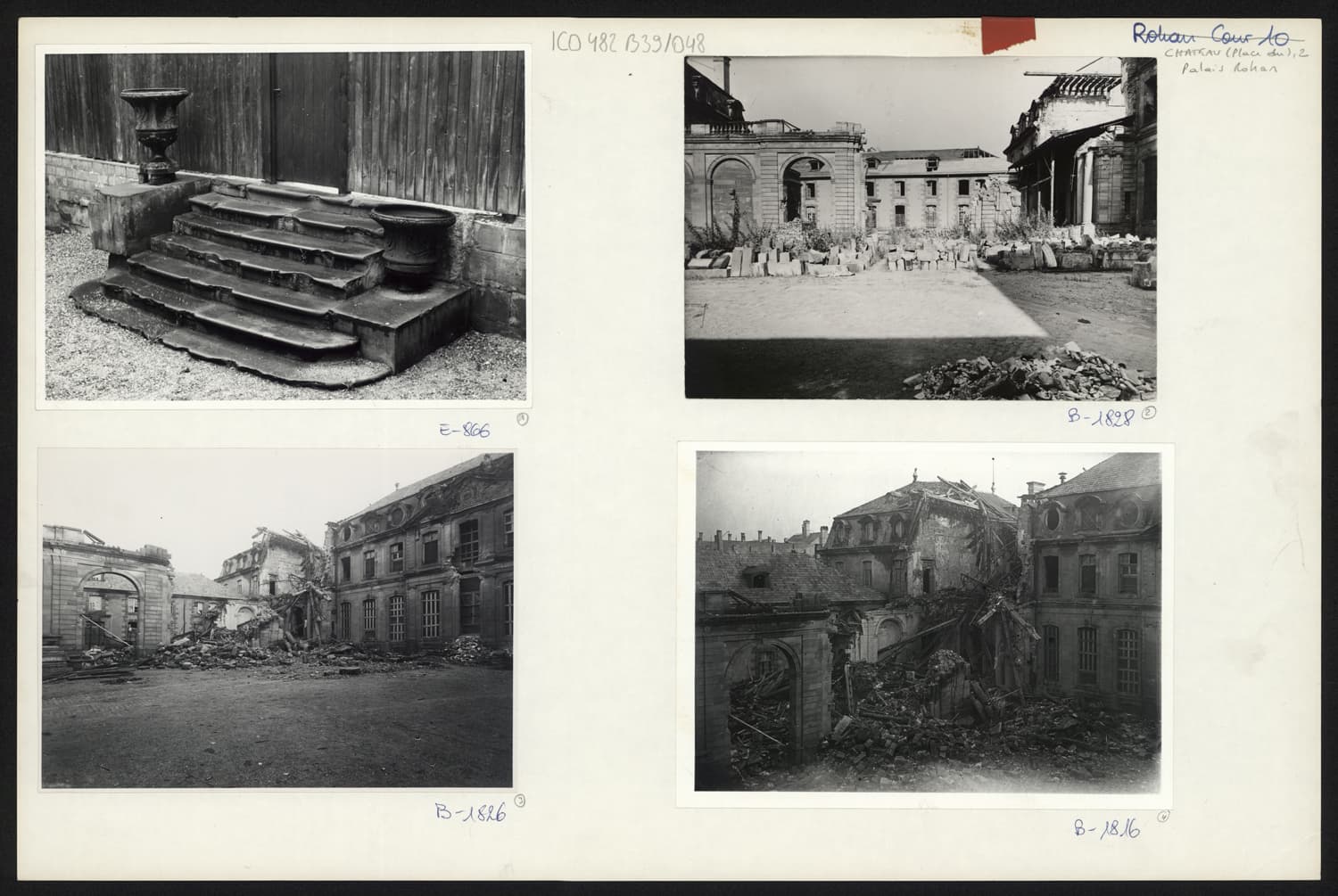 Vues d’ensemble et de détail des dommages de guerre sur la cour d’honneur, la cour secondaire, le pavillon sud-est et d’un escalier.