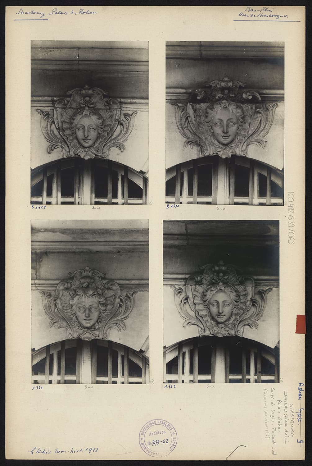 Vues de détail des mascarons aux figures des Heures (?) du corps de logis du côté de l’Ill.