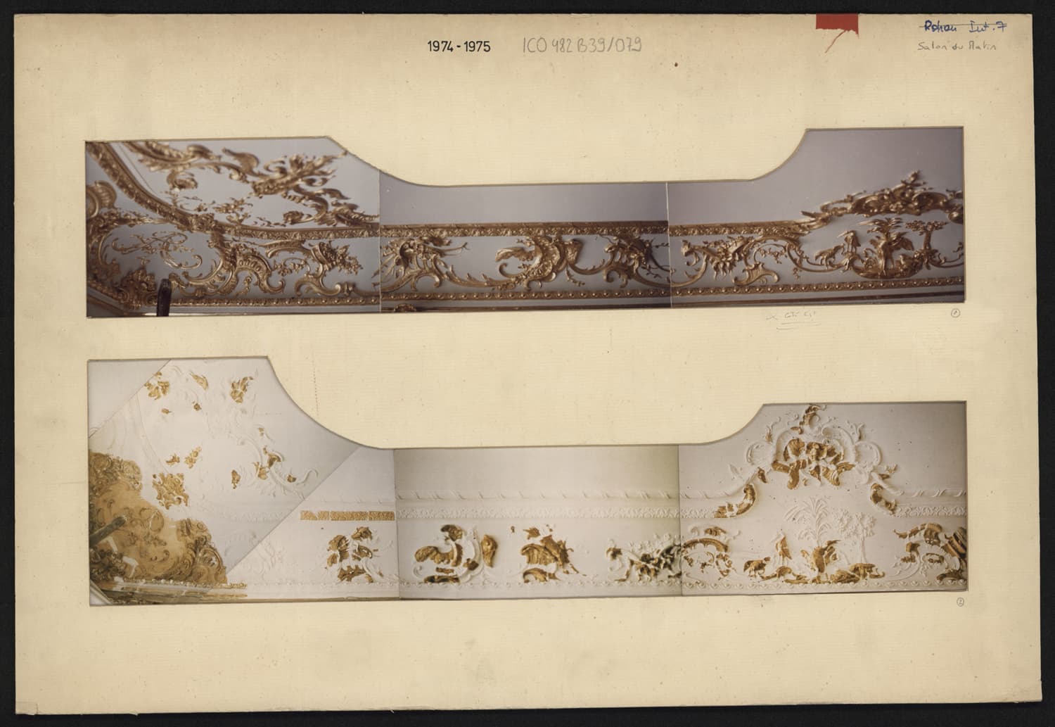 Vues de détails avant et après restaurations du plafond du salon du matin.