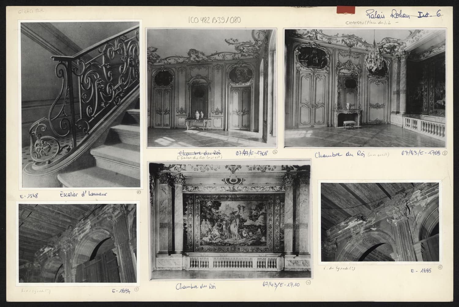Vues d’ensemble de la chambre du roi, vues de détail de la rampe de l’escalier d’honneur et des arcades de la salle du Synode (?).